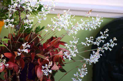 Aussi extraordinaire, voici un Haemeria, plante originaire de chine, réputée difficile à faire refleurir. Également présente chez moi depuis plus de trente ans, elle propose chaque année au-dessus de son feuillage pourpre, une floraison exceptionnelle avec trente hampes florales munies chacune à leur extrémité d'une vingtaine de fleurs ivoires.