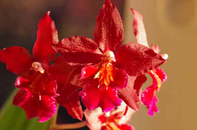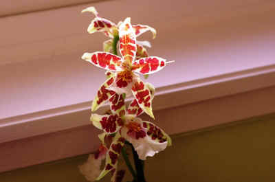 Les cambrias Sous ce nom commercial, beaucoup d'hybrides d'odontoglossum sont désormais commercialisés dans les grandes surfaces et jardineries. J'en possède quelques uns, très récents. Si certains sont parfumés, tous ont en revanche la particularité d'épanouir leurs feuilles longues et décoratives sur un bulbe allongé. Lorsque la floraison survient sur le bulbe de l'année précédente, un autre pousse à côté pour générer la suite de la croissance. Bien qu'on les trouve en abondance dans les magasins, ils ne sont pas si faciles à faire refleurir, faute probablement à des techniques de culture en masse, alternant des phases de croissance poussées à l'engrais avec des périodes fraîches, parfois en frigo, destinées à stopper la floraison, comme en témoigne la dernière photo où un miltonia peine à éclore. Comme pour les phalaenopsis, la variété de formes et de couleurs est importante.