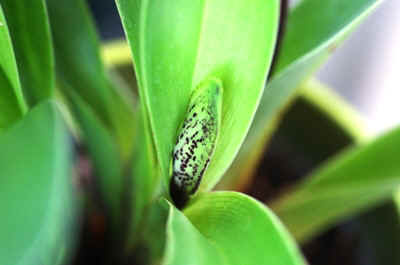 C'est une plante récente que je possède depuis 2 ans. J'ai rarement réussi à faire refleurir ce type d'orchidée. Mais cet exemplaire doit se plaire au milieu de ses congénères, car elle a daigné fleurir à nouveau. Les "paphios" sont d'autant plus précieux qu'ils ne consentent à donner qu'une unique fleur. L'attente du bouton floral jusqu'à l'épanouissement total a cependant pris plusieurs semaines, mais quel résultat : la fleur a une envergure de 13 cm !