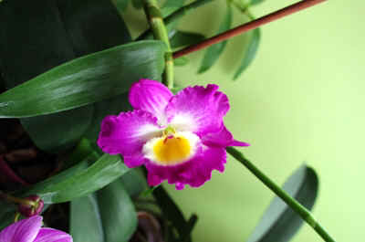 Les dendrobiums Je possède aussi depuis une paire d'années, deux plants de dendrobiums. Généralement forcés dans des serres, ils vous arrivent avec des grappes de fleurs mais c'est toute une histoire pour les acclimater et les faire renaître à nouveau. J'ai cependant eu beaucoup de chance avec une dizaine de fleurs roses réparties dans les deux pots. Elles sont presques semblables, mais l'une des plantes a souligné de noir le milieu de son inflorescence.