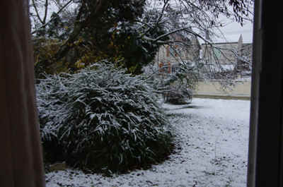 Le 1er décembre 2017, maison, première neige : J'ai parcouru toutes les fenêtres de la maison et pris des photos : je voulais rester dans l'étonnement, garder l'apparition de la neige, le ravissement qu'elle provoque en nous.